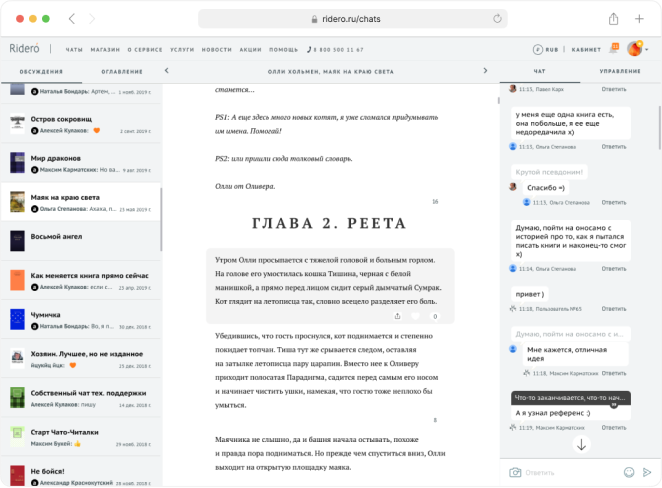 Rideró постоянно улучшает свой сервис — мы стремимся освободить писателя от рутинного труда. Мы активно развиваем собственный книжный магазин. Также вас ждут новые форматы и услуги.