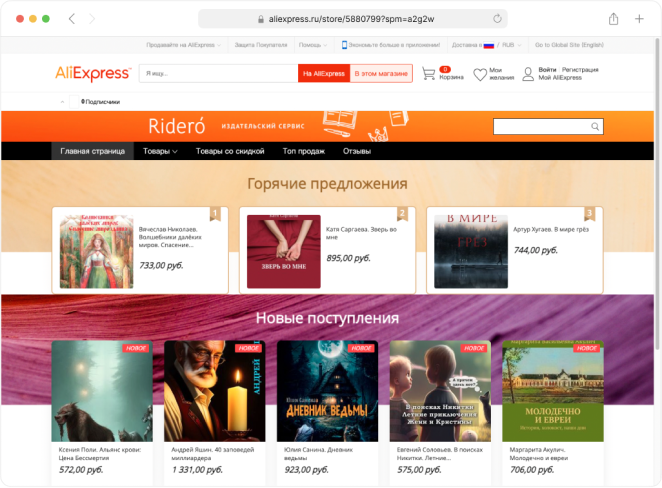 Печатные книги независимых авторов, опубликованные с помощью сервиса Rideró, продаются в крупнейшем мировом онлайн-магазине Aliexpress.